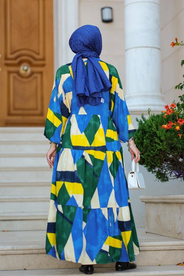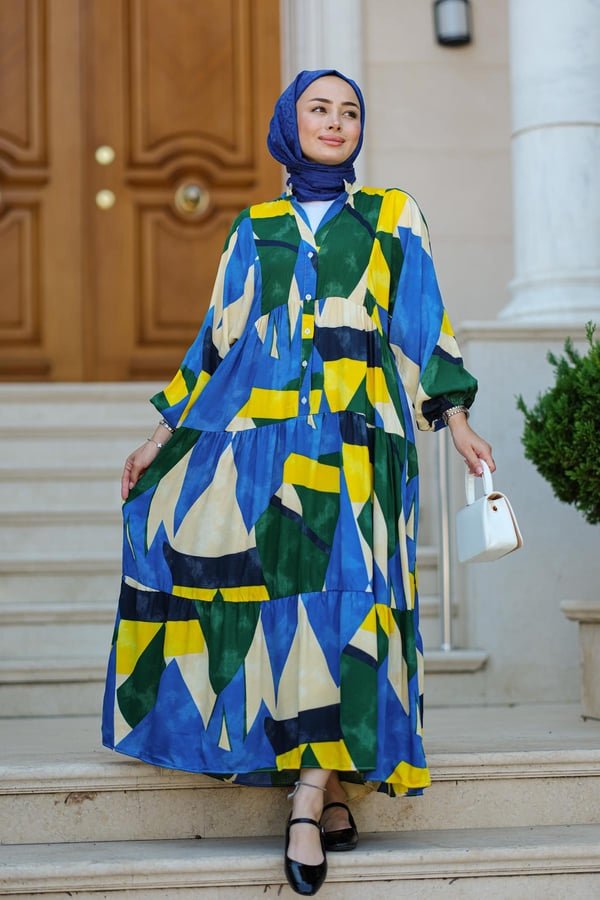 فستان نسمة – تصميم منعش بلون أزرق سماوي مع طبعات فنية بألوان متعددة.