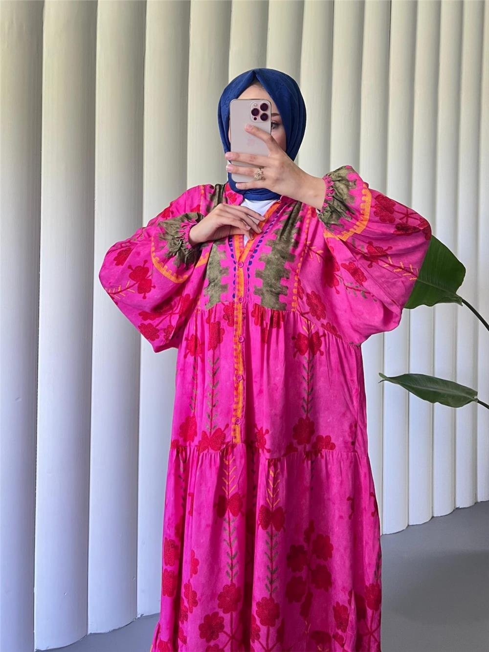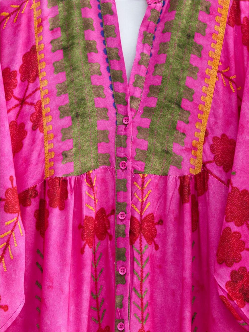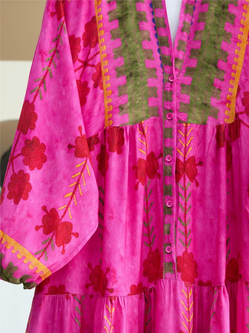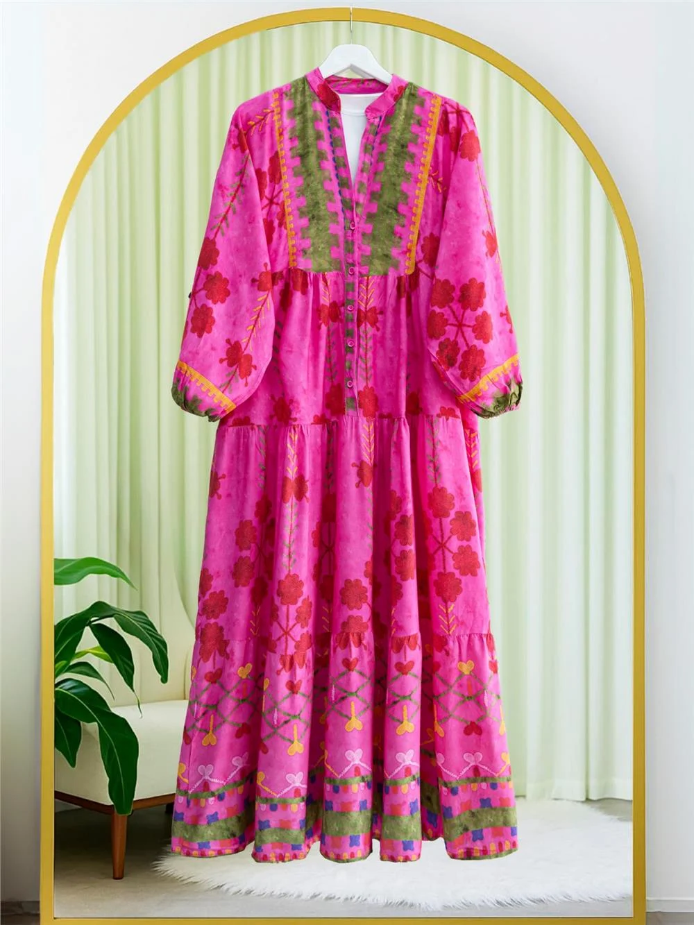 High Collar Half Buttoned Viscose Dress with Elastic Sleeves -Pink