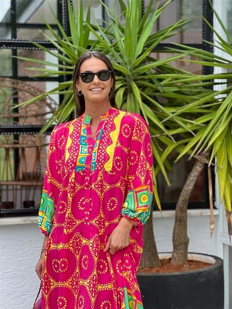 The Nasmah Dress features a patch-style print with a flowing silhouette and airy fabric for all-day ease and radiance.